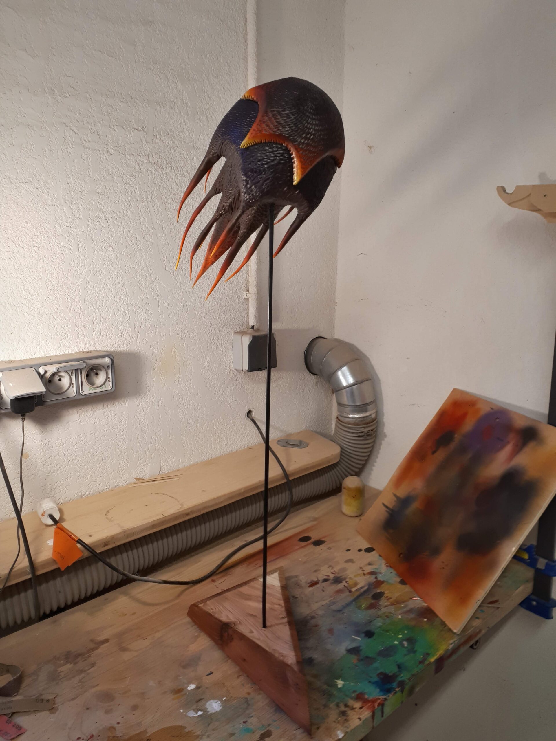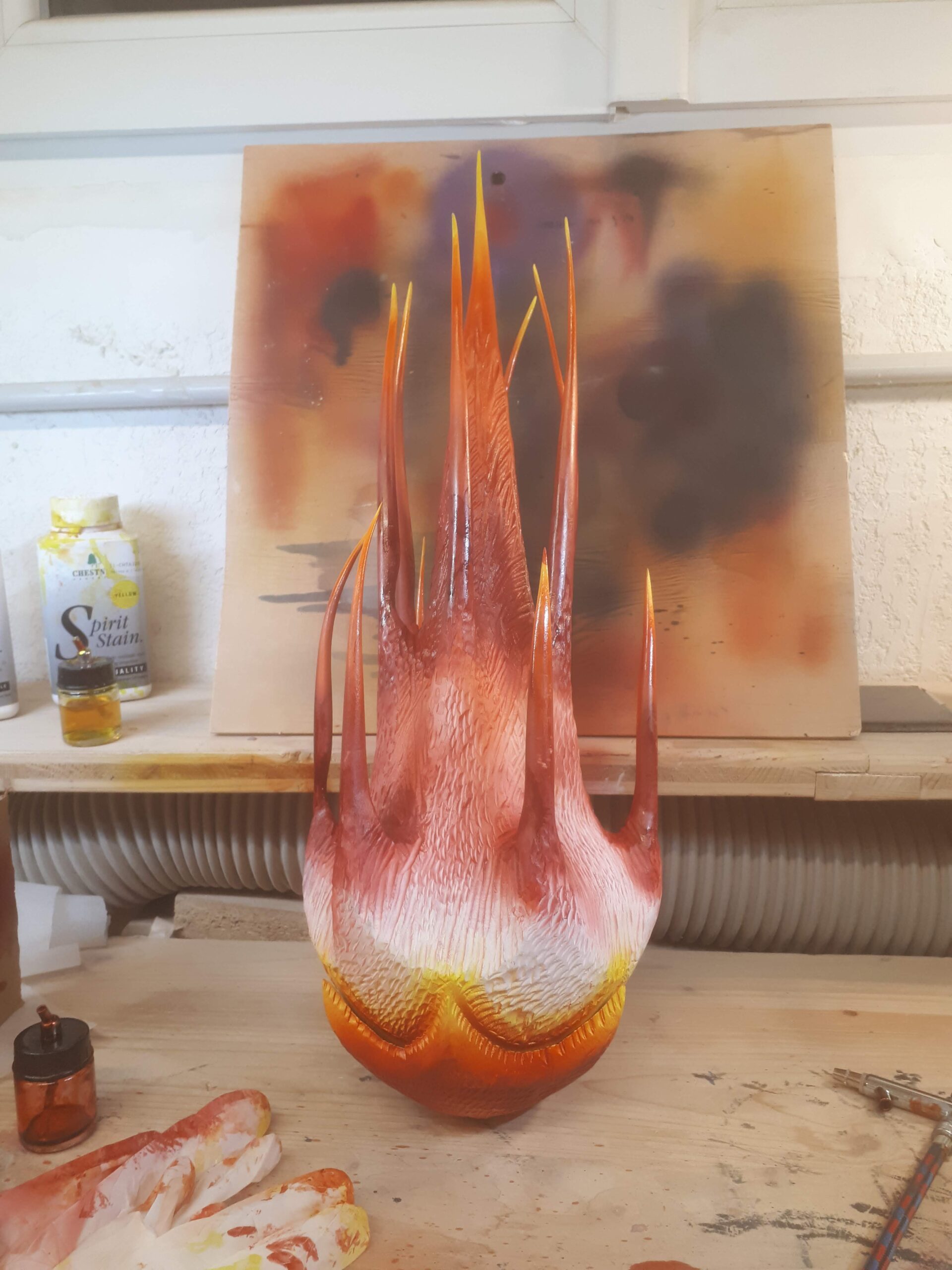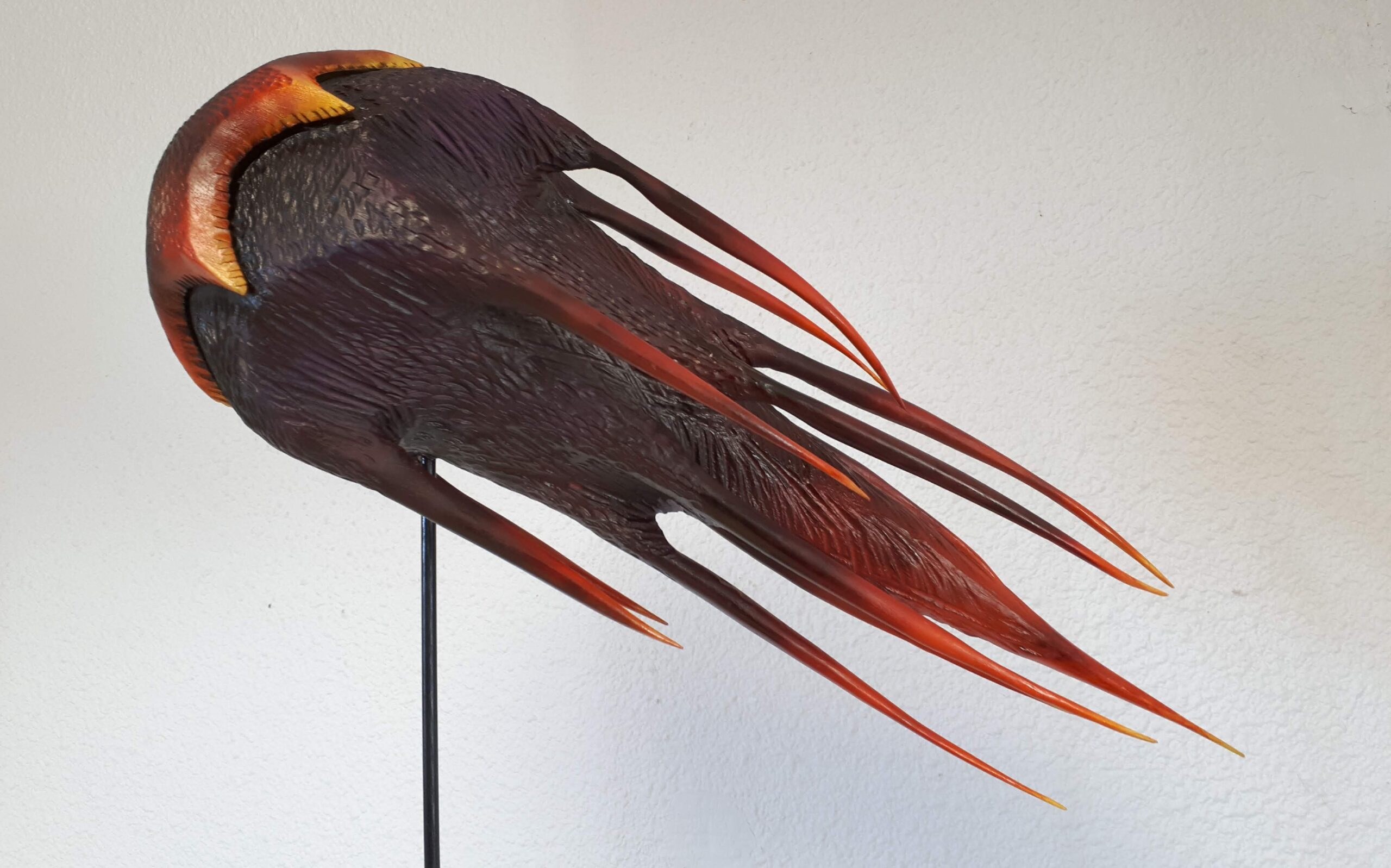 Convertida en su pieza de examen final en la prestigiosa École Escoulen de Francia, esta escultura nació de madera de arce laminada que fue minuciosamente torneada, ahuecada, cortada, tallada, texturizada y aerografiada en ardientes tonos negros, morados, rojos, naranjas y amarillos.