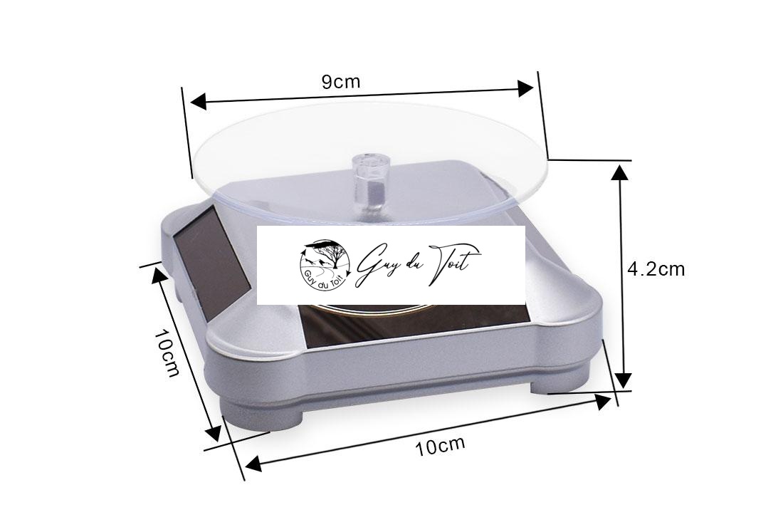 Expositor giratorio plateado. Tamañoï¼Î¦90mm. Se puede girar 360 grados, se puede utilizar para la exhibición de bolígrafos, joyas, relojes, pasteles, etc, que atraerá la atención de los demás.Funciona con batería 1 AA (no incluced) y la energía solar. En condiciones de mucha luz, puede optar por la energía solar y ser respetuoso con el medio ambiente. Además, también puede optar por utilizar una pila AA cuando no haya suficiente luz.