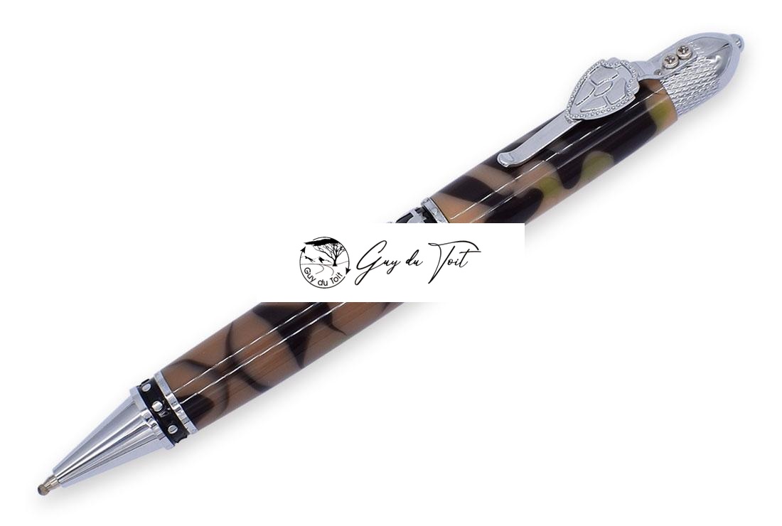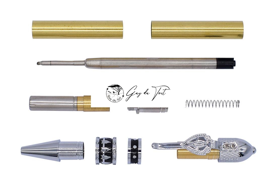 Chrome plating. This pen is a great gift for military fans. The cap features a soldiers’ helmet. A riveted band around the pen tip and center band. The warriors theme is completed with a shield pen clip. Accessories: Bushings(RZ-BP407#-BU). Tubes (RZ-BT407). Drill Bit (RZ-DB3/8)
