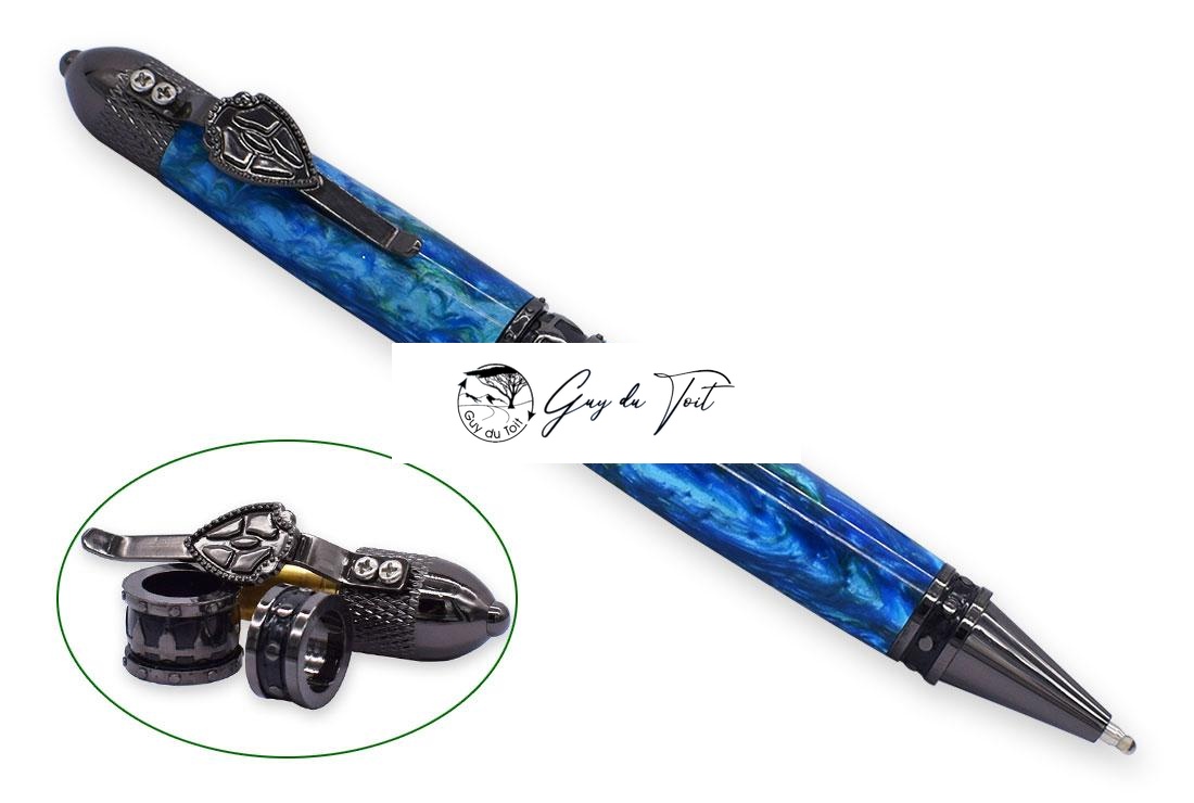 Gold plating. This pen is a great gift for military fans. The cap features a soldiers’ helmet. A riveted band around the pen tip and center band. The warriors theme is completed with a shield pen clip. Accessories: Bushings(RZ-BP407#-BU). Tubes (RZ-BT407). Drill Bit (RZ-DB3/8). You can download the PDF instructions for this kit here.
